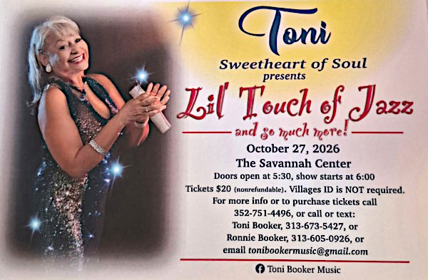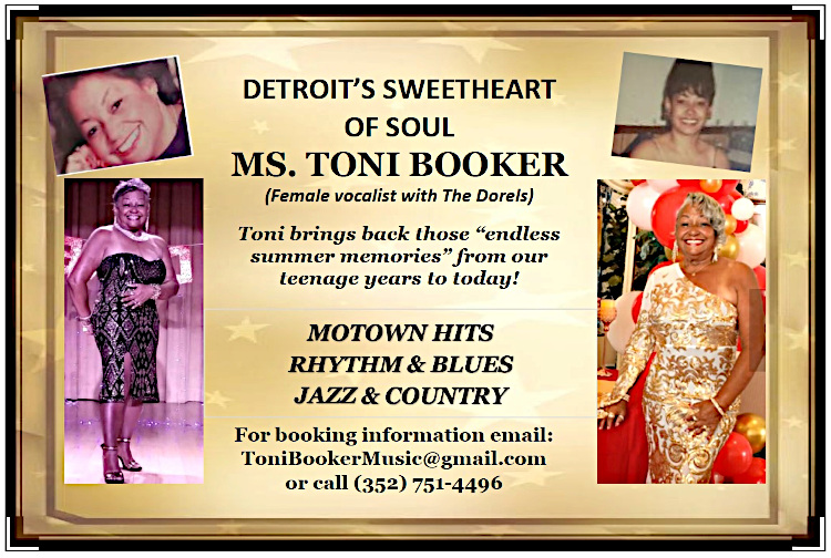 I can be contacted at (352) 751-4496, or email address, tonibookermusic@gmail.com. You can also become my friend on Facebook, under ToniBookerMusic. To see one of my performances, please go to YouTube and look up “Motown Concert with Toni Booker, length of time; 1:02:49”.