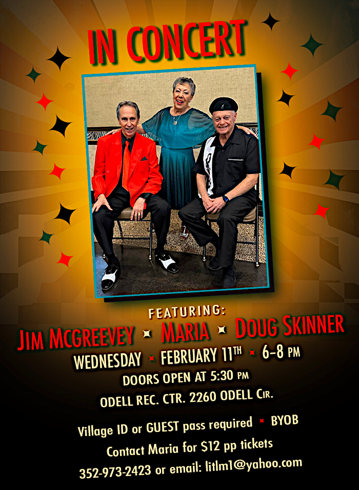 We are having another IN CONCERT on February 11th. Details for this terrific show are on the attached flyer. We are hoping for another “Sold Out” performance so don’t delay in buying your tickets. BY mail, send your check to Ed Williams, 2204 Bachman Path, The Villages, Fl. 32162 and your tickets will be sent to you by return mail. You can also buy in person from Maria at Doo Wop On the Porch meeting every Saturday morning at Lake Miona Rec. Ctr. shortly before 9:30 or shortly after 11:00 or from Jim or Doug, when you see them.